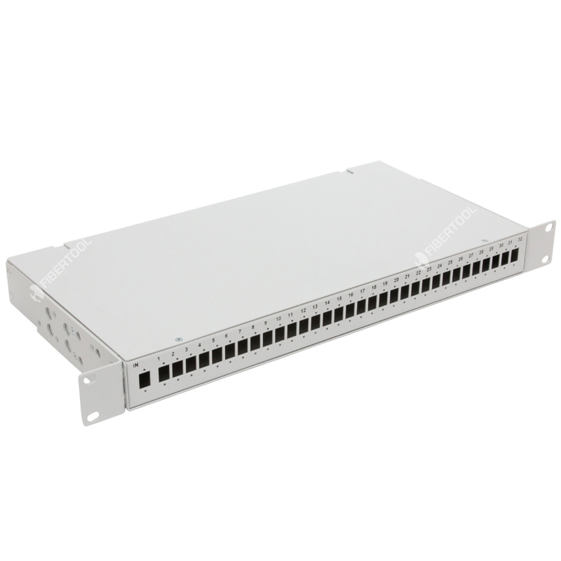 Максимальная емкость кросса – 33 портов. На лицевой части корпуса нанесена маркировка портов, где 1 порт отведен для входа и маркируется как IN, и 32 портов для выхода – маркировка от 1 до 32. Корпус стоечного кросса изготовлен из стали и покрыт порошковой краской. Задняя панель кросса представляет собой глухую стенку.
